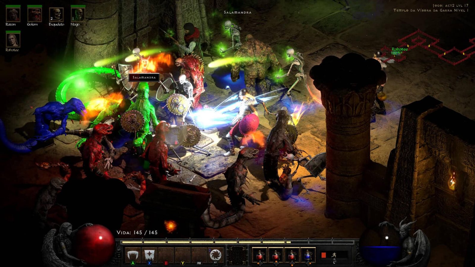 Se este for o seu primeiro contato com a franquia, saiba que Diablo II não é moleza. Jogar sozinho exige paciência e muita estratégia, experiência que fica mais leve e agradável em co-op. Você pode até contratar um mercenário pra te ajudar, mas nada melhor que dividir as batalhas, lootings e teleportes com outros jogadores. Se a party com 8 parece muita coisa pra acompanhar na tela, imagina se cada um levar seu próprio mercenário junto. Com um Necromante na equipe, com suas caveiras e golems, aí sim a coisa fica caótica de vez.